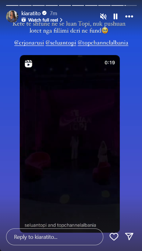 Këtë të shtune ish banorja e BBV është ftuar në emisionin ‘Se luan Topi’.Me një story të postuar në Instagram ajo bënë të ditur që ka përjetuar shumë emocione. Kiara në këtë video shfaqet duke qarë, por dhe e lumtur njëkohësisht!