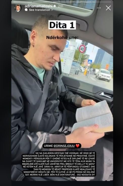 “Urime Drin Sejdiu. Siç na sugjeron kryetari ynë vizionar, në vend që të nervozohemi gjatë kolonave të përjetshme në Prishtinë është momenti i përsosur për t’i dhënë vetës një diplomë të re.