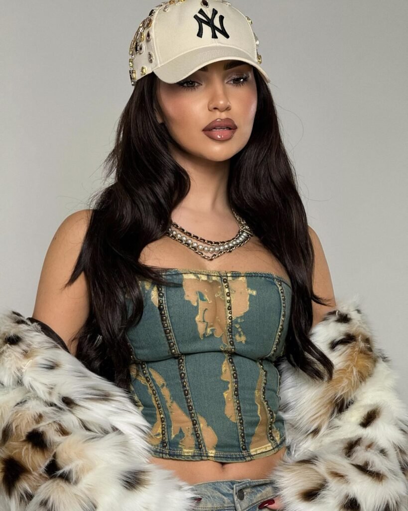 Ajo është e veshur me një kapele sportive, duke krijuar një pamje freskuese dhe moderne.