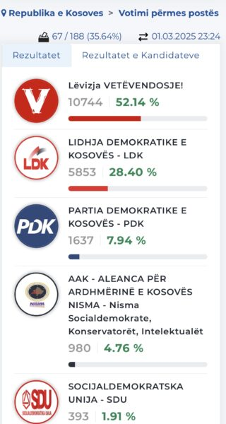 Këto të dhëna janë nga procesimi i 67 nga 188 vendvotimeve, apo 35.64%
