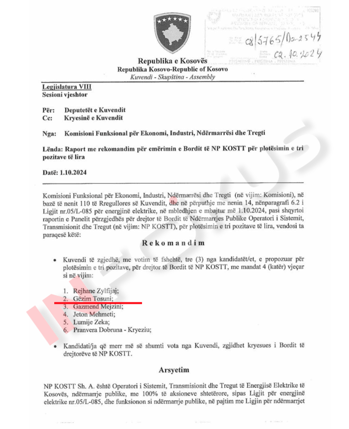 Gazeta Infokus ka siguruar dokumentin i cili dëshmon se së fundmi për të katërtën herë pushteti është duke u munduar që Tosunin ta punësojë në bordin e drejtorëve të Operatorit të Sistemit, Transmisionit dhe Tregut – Kosst.