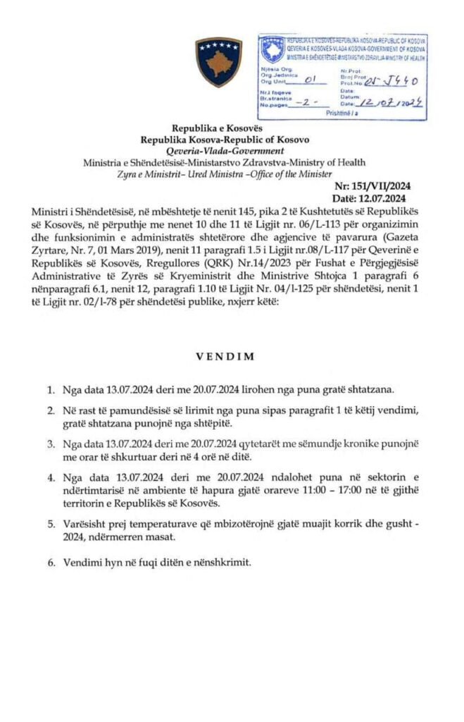 Me datë 12 korrik 2024, Ministria e Shëndetësisë ka nxjerrë vendimin që duke filluar nga data 13-20 korrik 2024, për shkak të temperaturave të larta, të lirohen nga puna gratë shtatzëna, ose të punojnë nga shtëpia, derisa qytetarët me sëmundje kronike të punojnë me orar të shkurtuar deri në 4 orë në ditë. Vendimi, gjithashtu, ndalon punën në sektorin e ndërtimtarisë në ambiente të hapura gjatë orarit 11:00-17:00 në gjithë territorin e Republikës së Kosovës.Me qëllim që institucionet dhe subjektet e ndryshme ta kenë më të lehtë zbatimin e vendimit për kategorinë e qytetarëve me sëmundje kronike, bashkëlidhur një listë e sëmundjeve kronike, të cilat mund të konsiderohen me rastin e zbatimit të vendimit.
