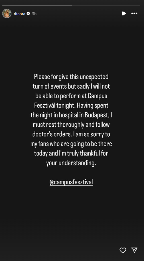 “Pasi e kalova natën në spitalin e Budapestit, më duhet të pushoj plotësisht dhe të ndjek udhëzimet e mjekut. Më vjen keq për fansat e mi që do të jenë atje sot dhe jam vërtet mirënjohës për mirëkuptimin tuaj”, ka shkruar tutje Rita Ora.