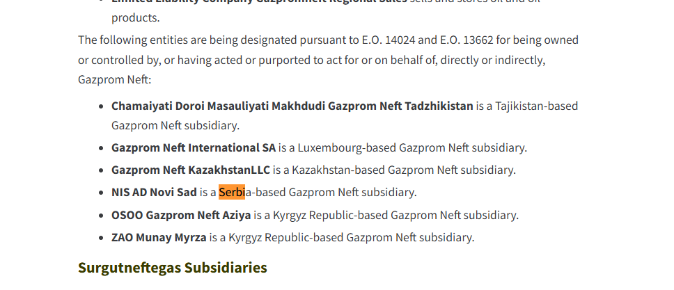 Departamenti i Thesarit amerikan përmes një komunikate zyrtare të lëshuar sot kanë konfirmuar sanksionimin e industrisë serbe të naftës “NIS AD Novi Sad” për shkak s është një filial i Gazprom Neft-it rus.