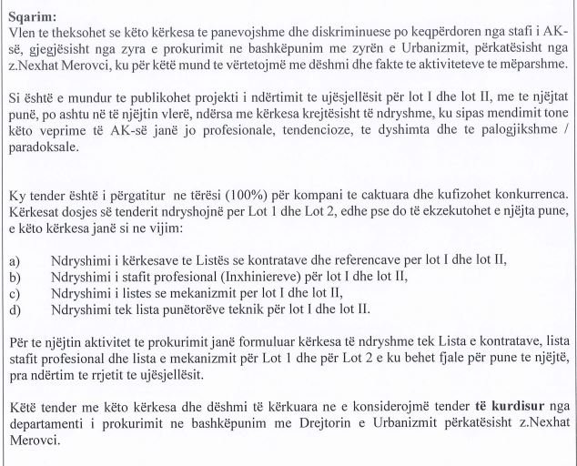 Ky tender është i përgatitur në tërësi (100%) për kompani të caktuara dhe kufizohet konkurrenca. Këtë tender me këto kërkesa dhe dëshmi të kërkuara ne e konsiderojmë tender të kurdisur nga departamenti i prokurimit në bashkëpunim me drejtorin e Urbanizmit, përkatësisht z. Nexhat Merovci”– thuhet në ankesë.