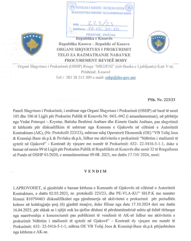 Në vendimin e lëshuar më 17 tetor 2024, OSHP ka pranuar pjesërisht kërkesën e Komunës së Gjakovës për diskualifikimin e operatorit ekonomik “Pevlaku” dhe të tjerë, për përfshirje në aktivitete të papërputhshme me dispozitat ligjore të tenderimit.