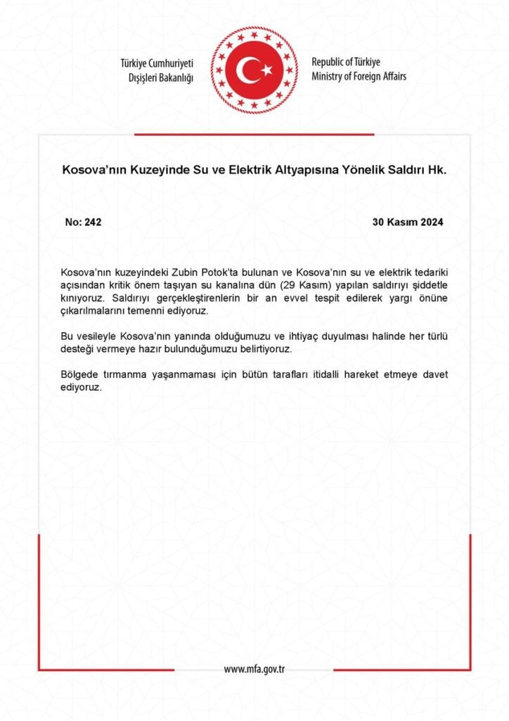 Ministria e Jashtme turke ka dënuar ashpër sulmin e rëndë të kryer gjatë mbrëmjes së djeshme në kanalin e ujit në Zubin Potok, në veri të Kosovës.