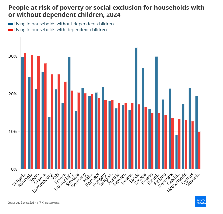 30.8 për qind e bullgarëve që jetojnë në familje me fëmijë në varësi të tyre janë në rrezik nga varfëria ose përjashtimi social.Pas tyre janë 30.4 për qind e rumunëve dhe 30.2 për qind e spanjollëve.Në kontrast, normat më të ulëta janë regjistruar në Holandë me 13 për qind, në Qipro me 12.7 për qind dhe në Slloveni me 9.8 për qind.Ndërkohë, 32.3 për qind e letonezëve që jetojnë në familje me fëmijë të pavarur ishin gjithashtu në rrezik. Pas tyre janë 29.9 për qind e estonezëve dhe 29.8 për qind e bullgarëve.Në Itali, kushtet e jetesës ndryshojnë në varësi të kombësisë. Në vitin 2023, 30.4 për qind e familjeve me të paktën një shtetas të huaj ishin në rrezik varfërie, ndërsa kjo përqindje ishte shumë më e ulët, vetëm 6.3 për qind, për familjet tërësisht të përbëra nga italianë.