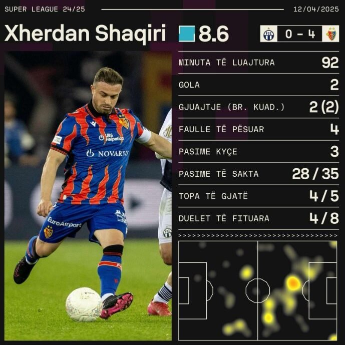 Pas 28 ndeshjeve të zhvilluara këtë sezon në kampionatin zviceran, Shaqiri numëron 13 gola dhe 14 asistime.