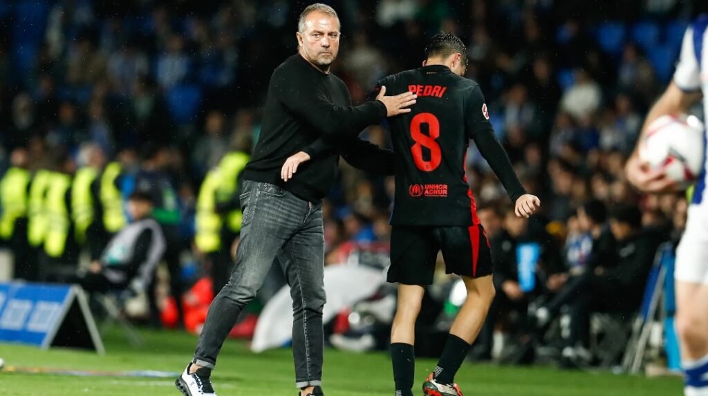 Pas pjesës së parë të ndeshjes, trajneri i Barcelonës Hansi Flick iu ankua gjyqtarit.