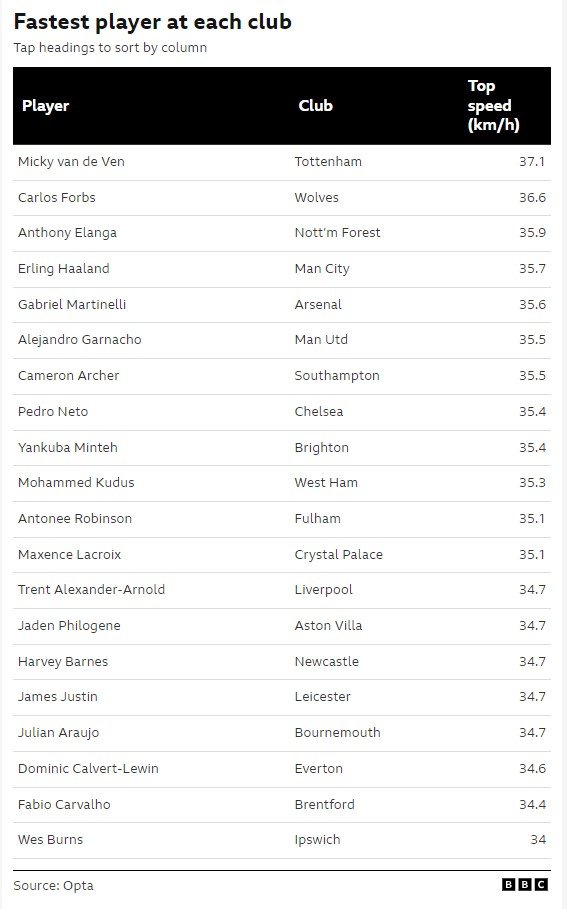 Të dhënat që u publikuan nga BBC Sport dhe Opta treguan se Van de Ven është lojtari më i shpejtë me 37.1 kilometra në orë.Ai ndiqet nga Carlos Forbs i Wolvesit që ka regjistruar shpejtësinë prej 36.6 kilometrash në orë dhe top treshja që kompletohet nga Anthony Elanga me 35.9 kilometra në orë
